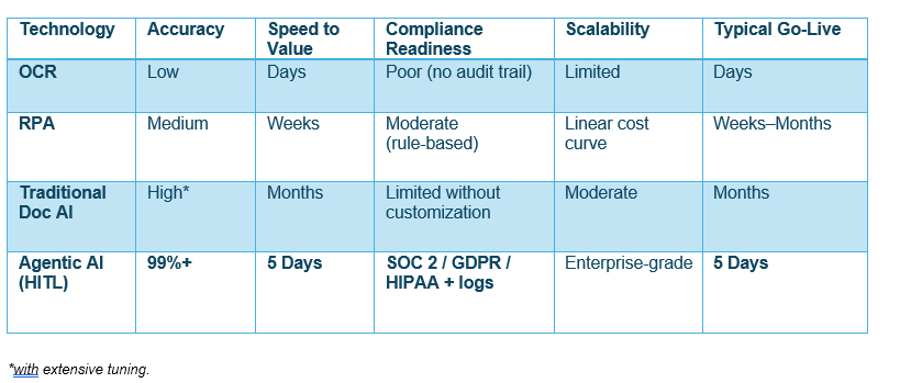 - Agentic AI is the only enterprise ready option: 99%+ accuracy, 5 day go live, compliance first.