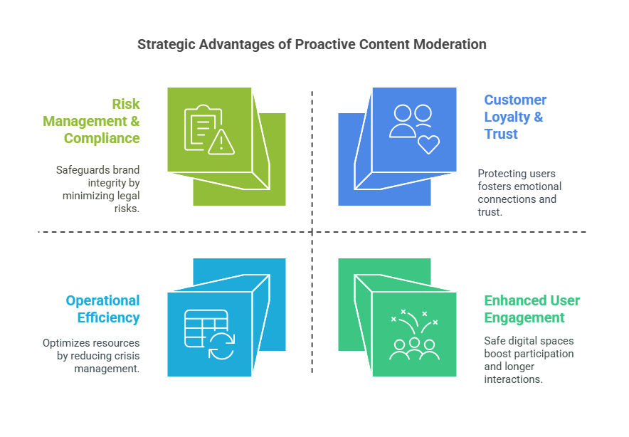 Beyond compliance, proactive content moderation offers strategic business advantages: