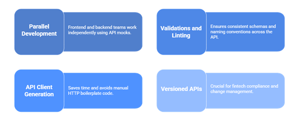 This approach provides numerous benefits for fintech development teams. OpenAPI specifications serve as executable documentation, enabling automatic generation of client libraries, server stubs, and testing frameworks. Teams can work in parallel on different services using shared contract definitions, reducing integration delays and miscommunication.