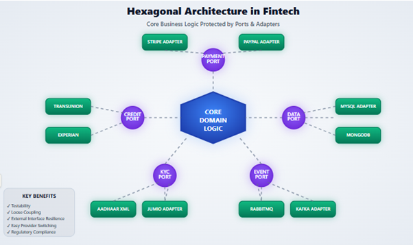 In fintech applications, hexagonal architecture proves particularly valuable due to the complexity of external integrations. Credit systems must interact with numerous third-party services: credit bureaus, payment processors, regulatory reporting systems, and partner APIs. Hexagonal architecture isolates these dependencies behind adapters, protecting core business logic from external changes.