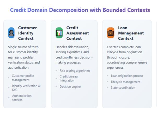 Effective credit system decomposition requires careful analysis of business capabilities and their interdependencies. Bounded contexts serve as the fundamental building blocks for this decomposition, each representing a distinct business capability with clear ownership and responsibility.