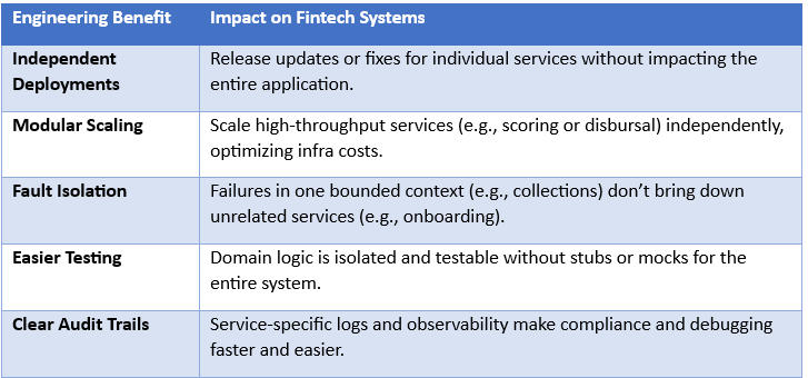 Each new regulation, partner API, or CX initiative requires changes that ripple unpredictably through the entire system. Even worse, credit systems are inherently domain-rich: onboarding, scoring, compliance, underwriting, disbursal, collections—each has distinct logic, yet are often handled by overlapping models and services in a monolith.