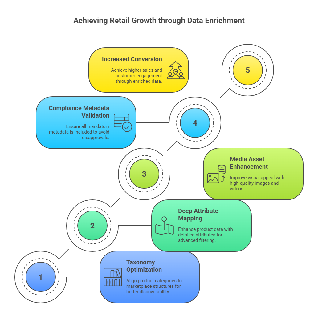 A global fashion brand faced 20% listing disapprovals monthly across its Amazon feed. The root cause? Poor taxonomy alignment and missing compliance tags. By deploying an AI-powered enrichment engine, the retailer: