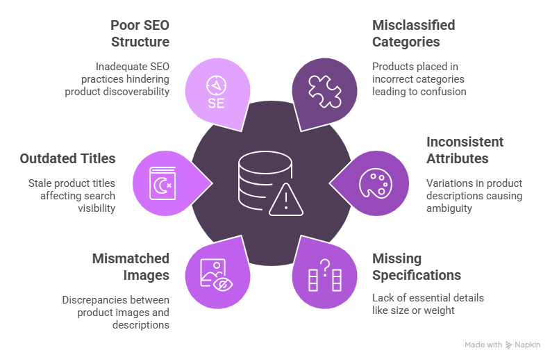 Search engines can’t index what they can’t understand. Inconsistent product titles, missing descriptions, and poor keyword optimization mean your products simply don’t appear in search results—even when customers are actively looking for them.