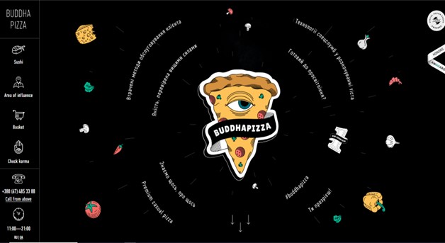 The Buddha Pizza15 embraces a goofy and cartoonish style by placing the main element of the brand – A pizza slice with a tag named ‘BUDDHAPIZZA’ and a big eye in the center that follows you with your cursor.