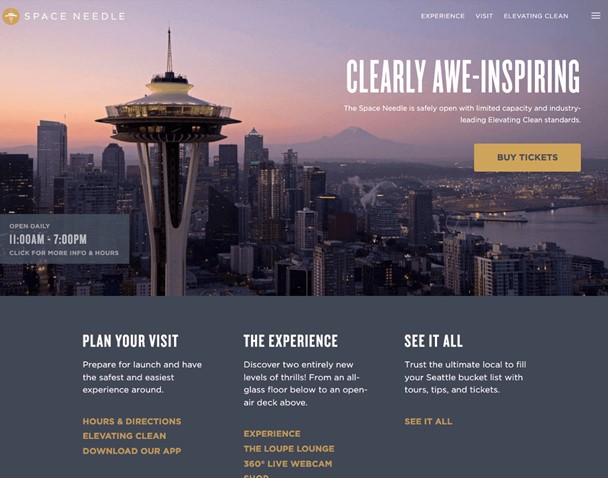 A gradient sunset color filled with orange and purple sky gives Seattle’s Space Needle 6 website a perfect look, making it look more realistic.