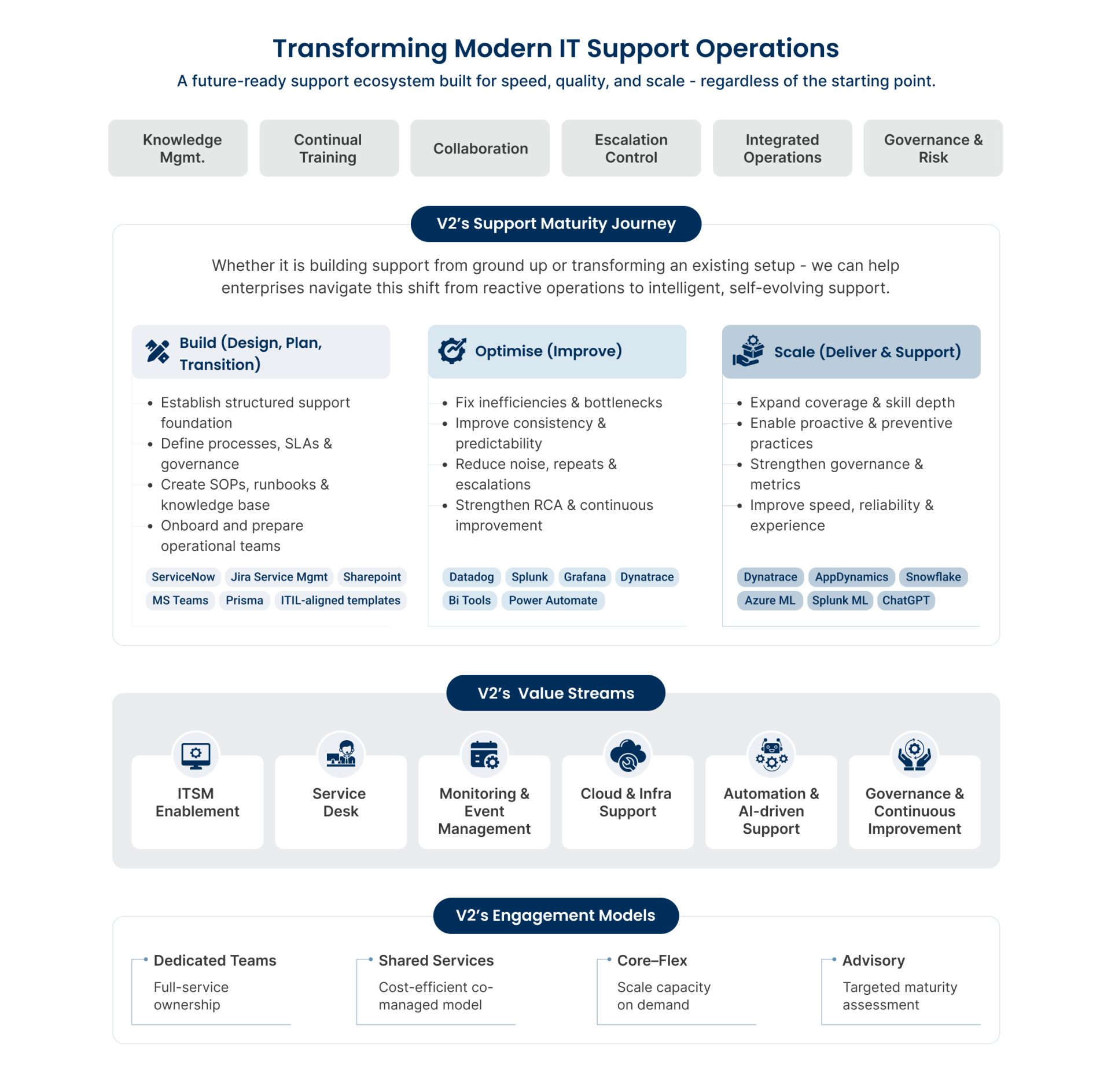 Our Offerings: ITIL aligned ITSM enabled Application Services, Infrastructure Support, and Strategy Consulting Scalable Operations Management, AI integration to expedite resolution and Operational Excellence