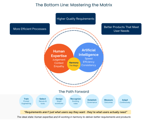 AI doesn’t eliminate the role of requirements professionals—it elevates it. Their work shifts from manual transcription and formatting to orchestrating human–AI collaboration.