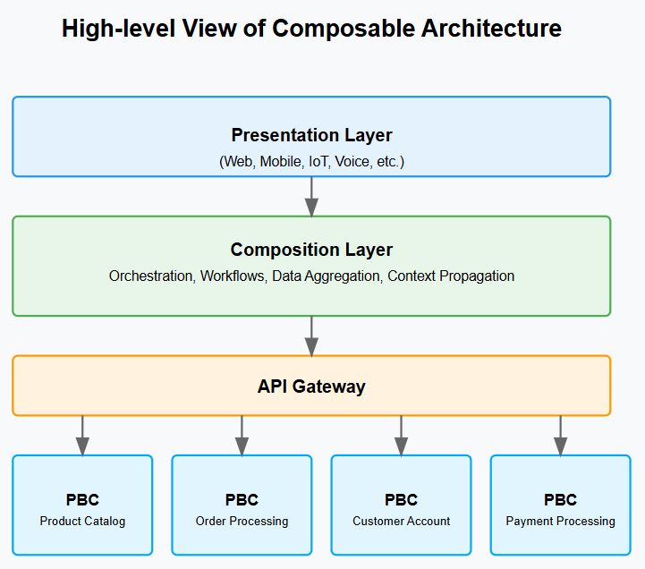 The composition layer assembles PBCs into end-to-end user journeys and business processes.