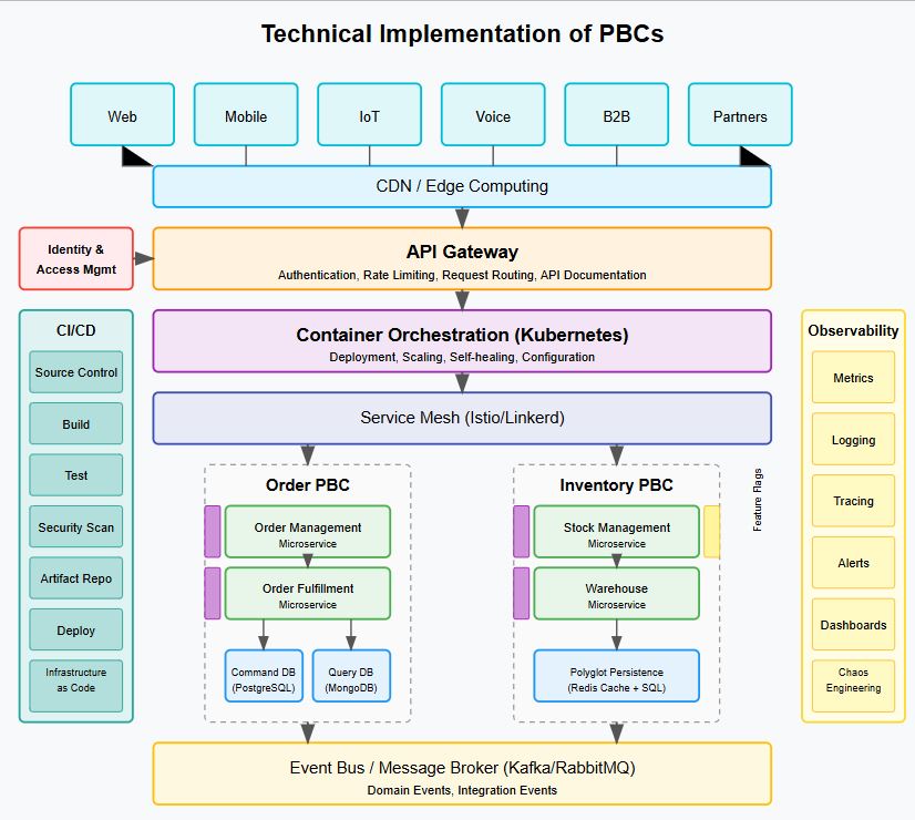 Microservices are a common implementation pattern for PBCs: small, independently deployable services organized around business capabilities.